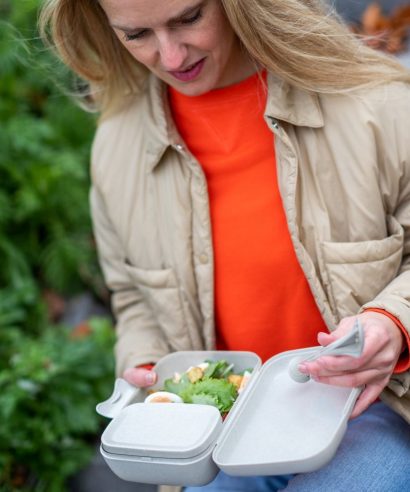 Il set portapranzo CANDY READY ha tutto il necessario per un pranzo sano anche in viaggio. Nella grande scatola CANDY L e nel contenitore a tenuta stagna CANDY S, insalate e condimenti, bastoncini di verdure e salse, panini e frutta sono ordinatamente separati l’uno dall’altro e il cibo rimane appetitoso fino al momento del consumo. Il set di posate KLIKK POCKET si adatta anche alla scatola grande e completa perfettamente il set per il pranzo.