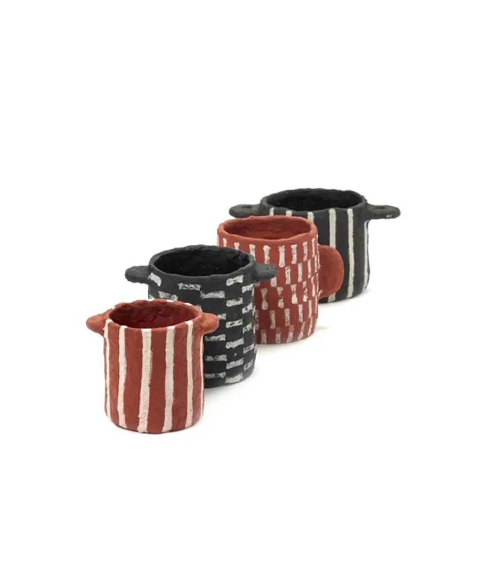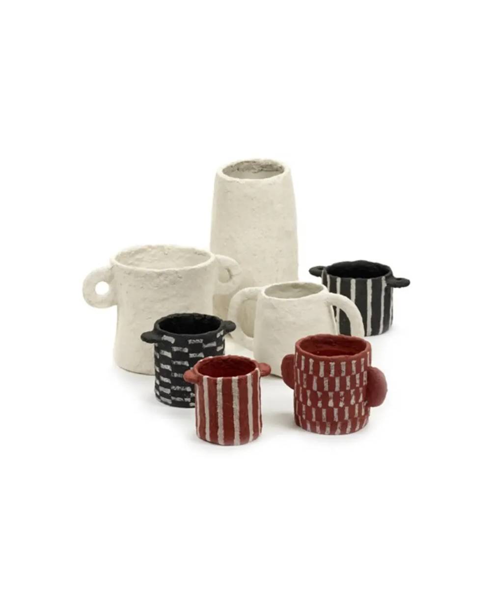 Alto e stretto, o piccolo e rotondo, con manici grandi o piccoli. Nessun boccale della collezione di cartapesta di Marie Michielssen è lo stesso. La struttura ruvida chiaramente visibile del materiale, i colori “primordiali” marrone rossastro, nero e grigio chiaro e le stampe punteggiate manualmente rafforzano l’individualità di ogni vaso con tutte le sue imperfezioni, proprio come fa la Natura nelle sue creazioni.